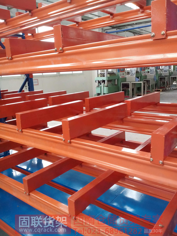 某公司重型模具架,采用重型高位貨架+跨梁的結構,跨梁架于橫梁上,方便用叉車存取模具,每層可存放重達3T左右的模具。